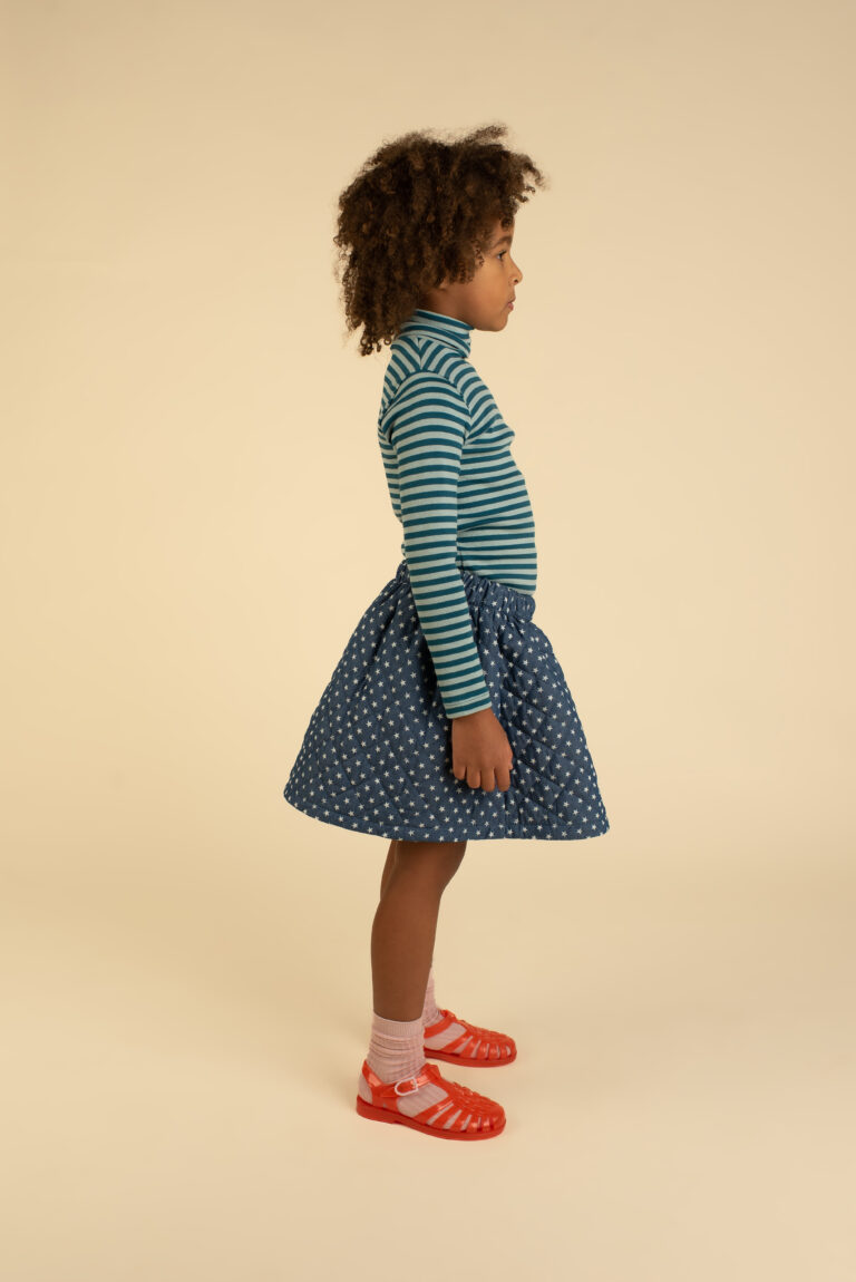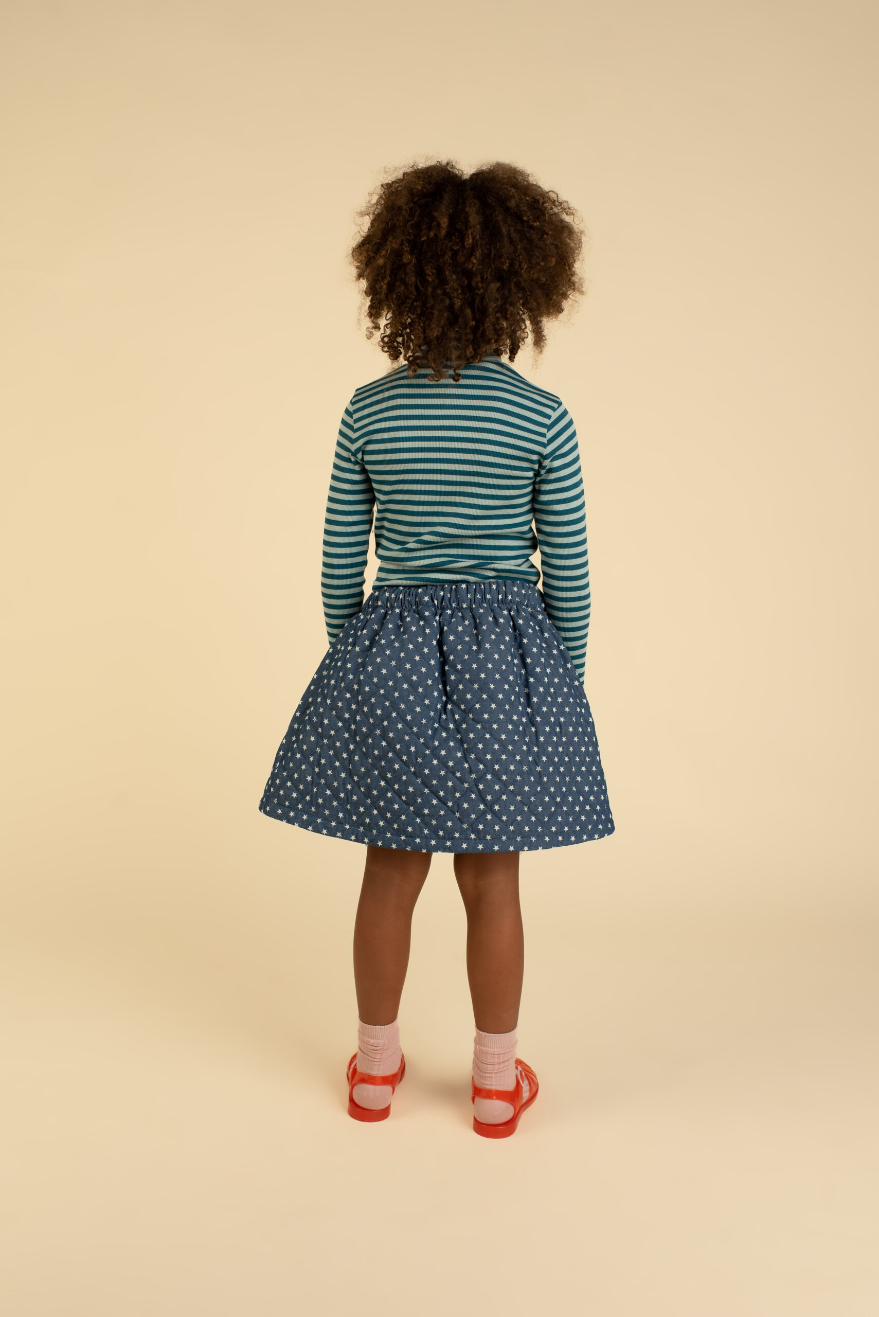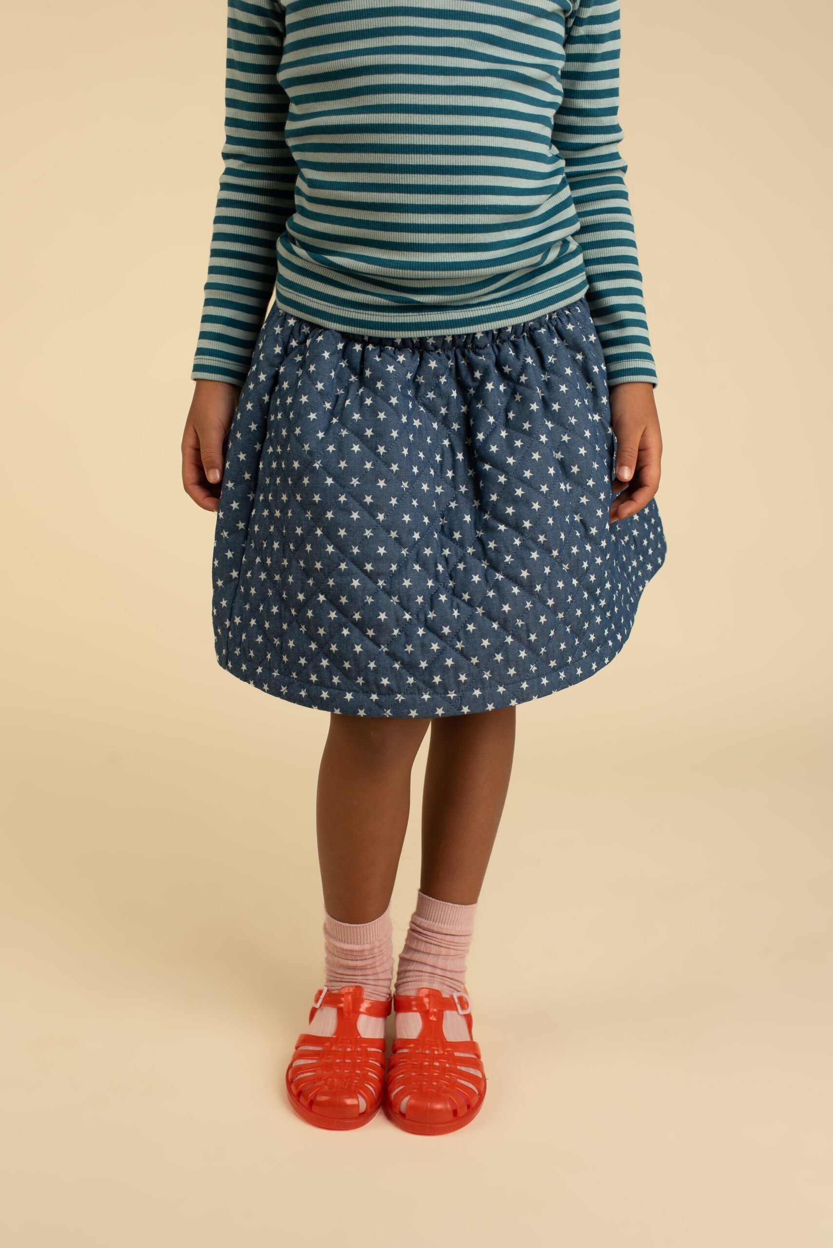 Šis dygsniuotas džinsinis sijonas su subtiliu žvaigždučių raštu yra minkštas, tačiau puikiai išlaiko formą – lengvas būdas susikurti išraiškingą įvaizdį. Derinki su mūsų dygsniuota džinsiniu švarkeliu ir susikurk jaukų, žaismingą komplektą betkuriai šventei.