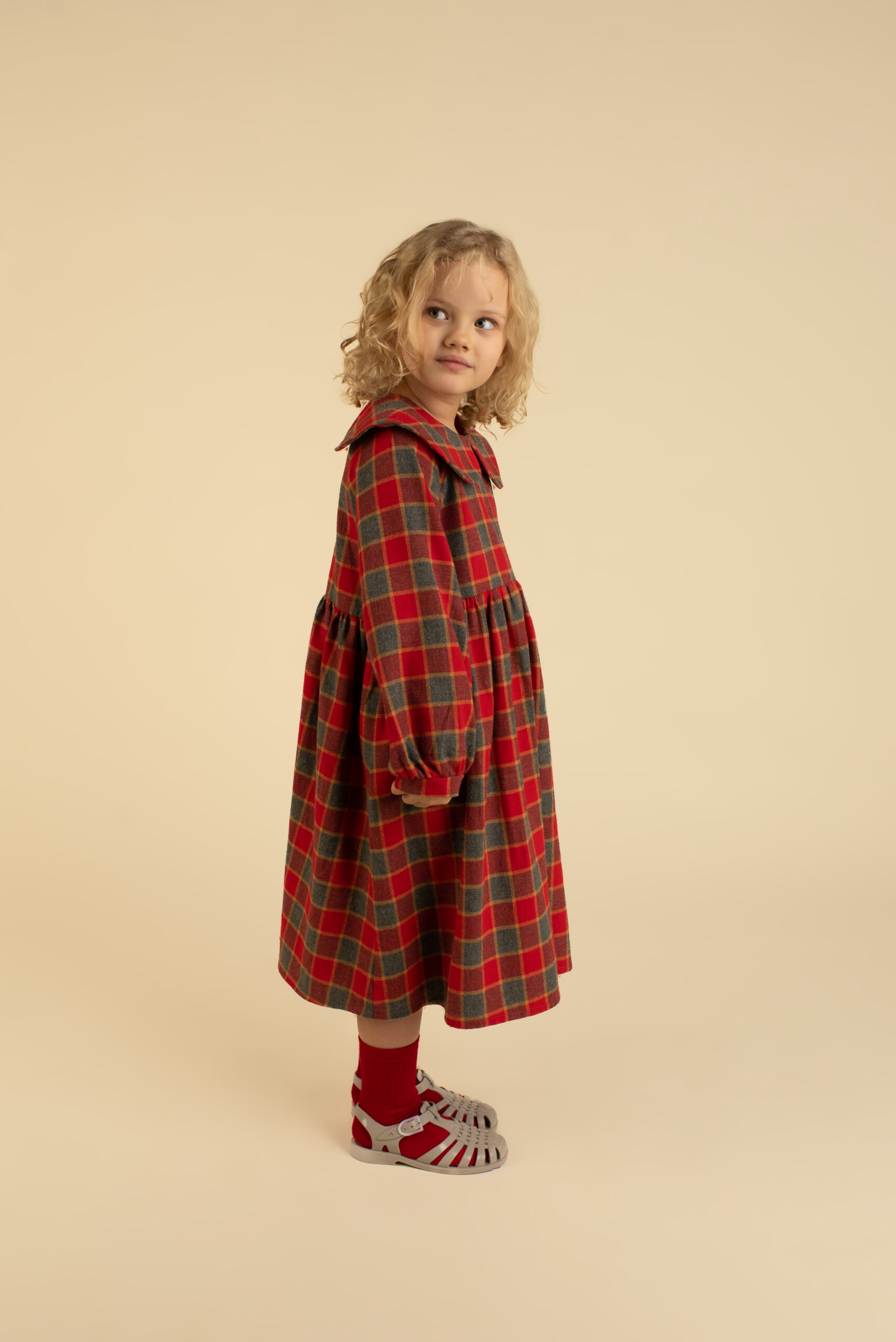 A soft flannel cotton dress with bold large checks, made for celebrations and cozy days alike. The big round collar and small back button add a charming, vintage touch, while the midi silhouette gives plenty of room to twirl and move. Just the right piece for parties, family gatherings, and every festive moment in between.